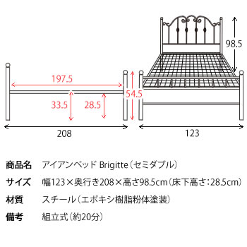 商品名 アイアンベッド Brigitte(ブリジット) サイズ シングル:幅103×奥行き208×高さ98.5cm セミダブル:幅123×奥行き208×高さ98.5cm 床下高さ:28.5cm 材質 スチール(エポキシ樹脂粉体塗装) 備考 組立式(約20分) 配送について ※こちらの商品はメーカー直送の為、代引でのお取扱いができません。